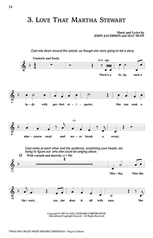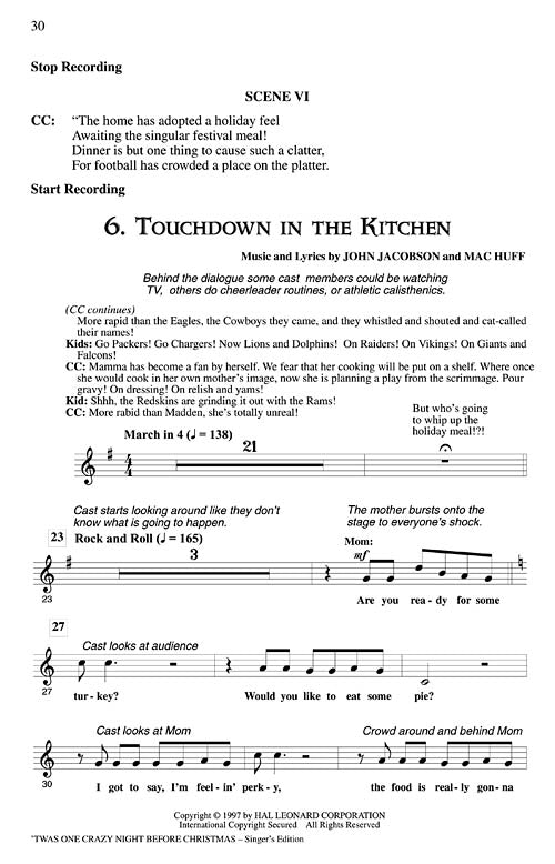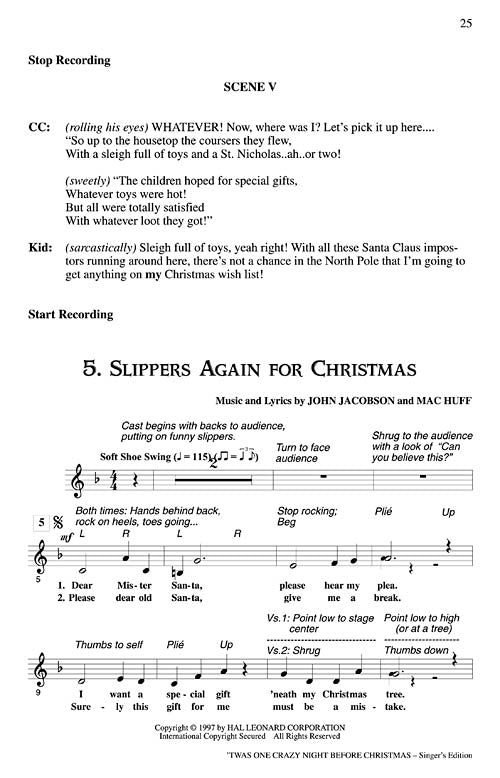 'Twas the night before Christmas and all through the house, not a creature was stirring, not even a...wait a minute!?! What's going on here - Mom's running pass plays in the kitchen, Sis is doing her best Martha Stewart imitation, Dad and the Uncles are taking root in front of the TV, and the kids are hmmmm??? Take a light-hearted look at Christmas in the typical American household with clever songs, hilarious antics and a full-evening of entertainment that will leave your audience in stitches! The Teacher's Manual comes with the full script, accompanied songs, and choreography suggestions. The Singer's Edition provides vocal lines,script and choreography only. Perform the show with piano alone, or add a real 'show biz' touch with the professionally-recorded ShowTrax CD. Available: Teachers' Manual, Singer's Edition 5-Pak, ShowTrax CD. 35-minutes / Grades 1-6.