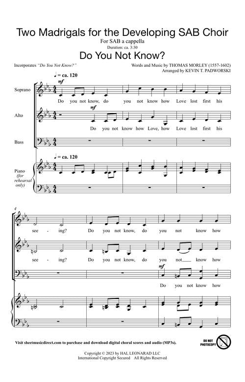 There is no better way to develop independent singers than with the polyphony often found in madrigals. Here are two such madrigals-- Full Fathom Five by Robert Johnson and Do You Not Know? by Thomas Morley-- for the developing SAB choir.