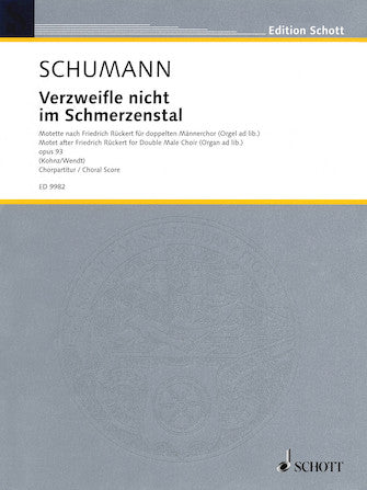 Motet for double male chorus with organ, ad lib. Described as religious song by Schumann, the motet Verzweifle nicht was first performed with organ on July 4, 1850, on the occasion of the 25th anniversary St. Pauli, the choral society at the University of Leipzig. A version with orchestral accompaniment was premiered in 1853. In a letter to Schumann, Herrmann Langer, the conductor of both premieres, called the motet one of the most stimulating and inspiring creations in male-voice literature.
