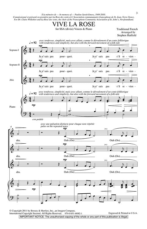 Adapted from an 18th century French folk song, this work tells the story of the female narrator who is in competition with a village beauty. A playful setting that summons up old world towns with their heroines, their rivalries, their heartbreaks and the village gossip in the center of it all. Duration: ca. 4:00.
