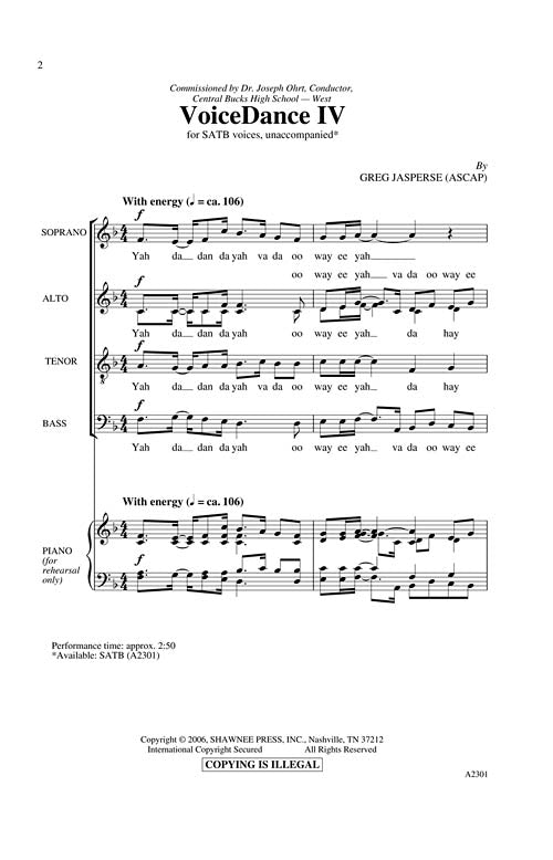 Shawnee Press continues this top-selling vocal jazz series of chorals by Greg Jasperse with a third installment, VoiceDance III. Greg has created a wordless vocal dance that has an African feel full of rhythmic, percussive and forward-moving vocal expression. Use of repetitive lines allows this work to be learned rather easily. Outstanding for festivals, concerts and even multicultural events!