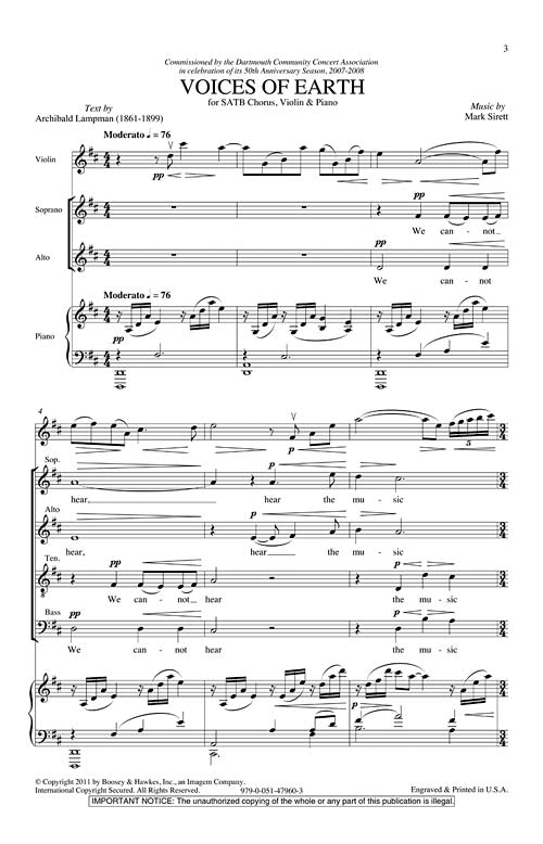 This tone poem begins and ends gently, but rises to a striking moment when describing the roar of the sea's surge, the might of thunder breaking and is based on a poem by one of Canada's finest poets, Archibald Lampman (1861-1899). Appropriate for an advanced high school, college or community chorus. Scored for SATB chorus, violin and piano. Duration: ca. 4:00.