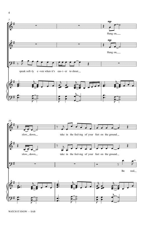 Although any piece with abundant references to snow and cold would easily be placed in the winter category, Watch it Snow is a song that can be sung at any time of year. The falling snow can serve as an expressive metaphor: just as we must wait for the storm to pass before we begin shoveling our driveways, we must rest and reflect in the moments of calm between the many challenges of life.