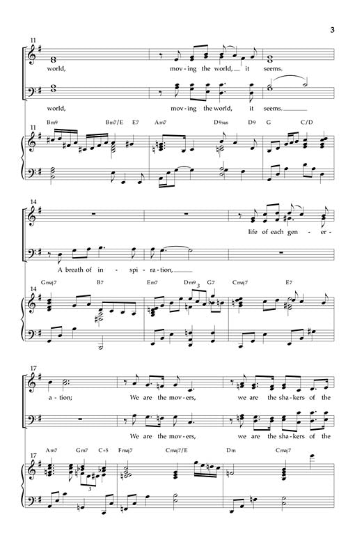 We Are the Music Makers by British poet Arthur O'Shaughnessy is one of the most moving poetic texts found in this oeuvre. Set to music by a number of composers, American composer and conductor Allan Petker provides us with a marvelous setting for SATB mixed voices with piano. This piece will be quite popular with high school voices but would also find a home with college/university or community choruses. Try it for American Music Month, for a commencement exercise, or grouped with other pieces by British composers.