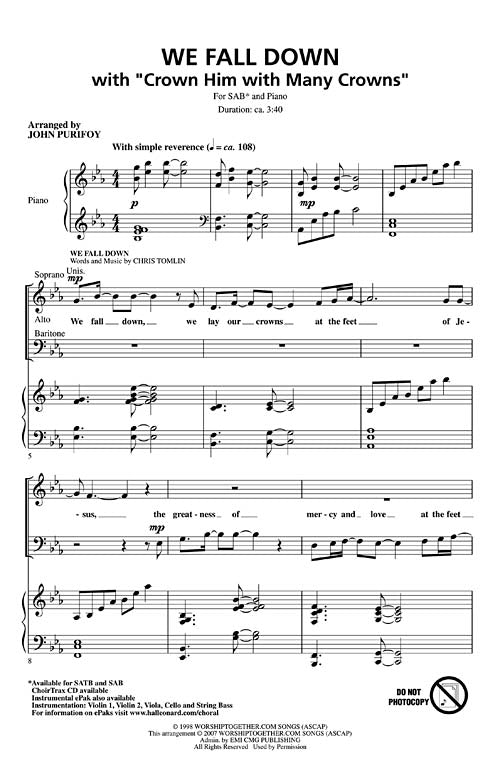 Based on the Chris Tomlin's worship song We Fall Down, arranger John Purifoy has created a moving and heartfelt anthem. Paired with the traditional hymn Crown Him with Many Crowns, this work may be used during the Easter season, or throughout the church year.Available separately: SATB, SAB, Instrumental ePak and ChoirTrax CD. Duration: ca. 3:40.