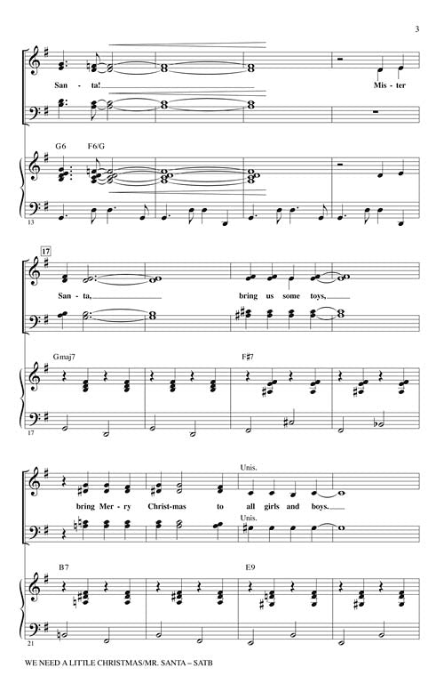 Brighten up your Christmas program with this irresistible mash-up of two holiday favorites! From the opening vocal bm-bm-bm's of Mister Santa to the cheerful 2-beat of We Need a Little Christmas, your whole audience will love this entertaining pairing! Available separately: SATB, SAB, 2-Part, ShowTrax CD. Combo parts available as a digital download (fl, tpt 1, tpt 2, tsx, tbn, syn, gtr, b, dm). Duration: ca. 2:30.