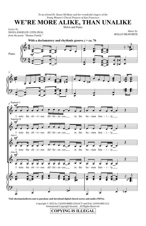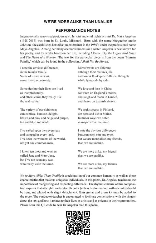 We're More Alike, Than Unalike is a celebration of our common humanity as well as those characteristics that make us unique as individuals. In this poem, Dr. Angelou teaches us the importance of recognizing and respecting difference.