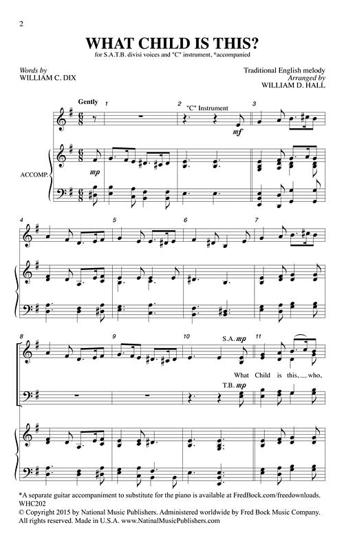 William Hall gives you exactly what you expect, the standard harmonies, the classic Greensleeves tune with a lute-like guitar accompaniment, and a straight-forward choral setting. In the end is a most satisfying and lovely setting for any high school to adult choir Christmas service or concert. A piano realization is provided if guitar is not available.