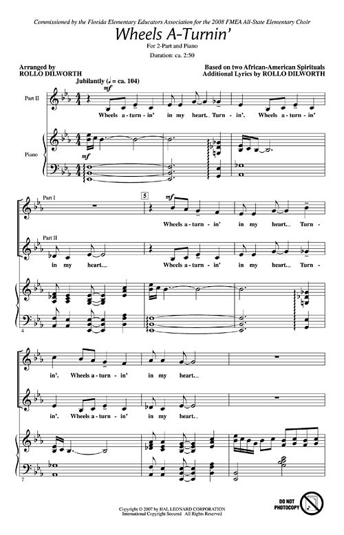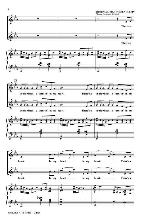Two traditional spirituals are creatively combined in this joyful setting. You can hear the wheel turning in the piano accompaniment and an optional descant at the end adds to the exuberance! Includes: There's a Little Wheel A-Turnin', Ezekiel Saw the Wheel.Available separately: 2-Part. Duration: ca. 2:50.