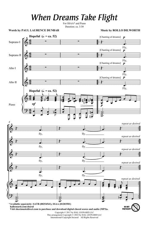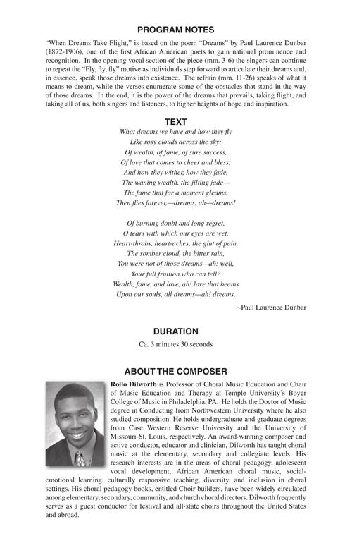 Now available for SSAA. Rollo Dilworth's choral is based on the poem Dreams by Paul Laurence Dunbar, one of the first African-American poets to gain national prominence and recognition. Singing of the power of dreams and when they do they take all of us, singers and listeners, to higher heights of hope and inspiration.
