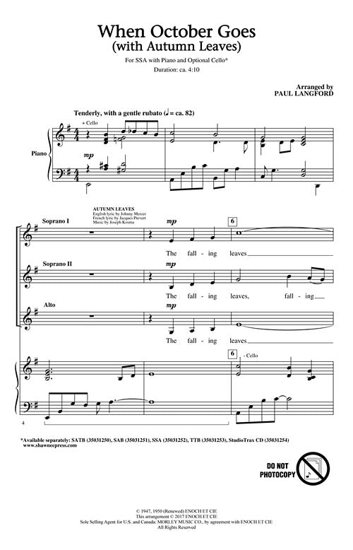 This modern day jazz classic written by Barry Manilow using the lyrics of Johnny Mercer is paired with the timeless Autumn Leaves, also a Mercer lyric with music by Joseph Kosma. This arrangement is respectful of both songs, weaving them together to sing a message of loving someone who's gone as well as growing older and remembering days past. Breathtaking!