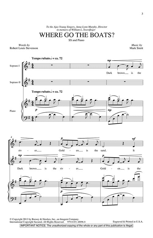 Using a text from the Robert Louis Stevenson collection of poems titled A Child's Garden of Verses, Mark has artfully captured the whimsy and wonder of this classic text. Poet Stevenson set the words from the perspective of a child and young people will quickly identify with both the words and the music. Duration 2 minutes 50 seconds