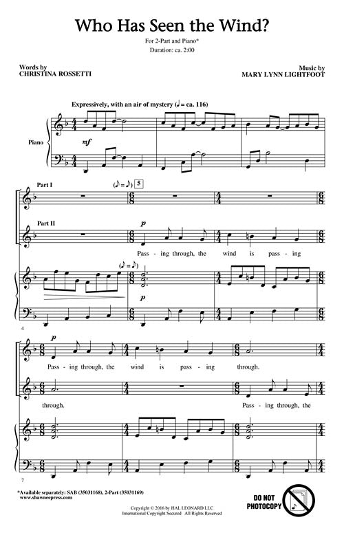 Christina Rossetti's mysterious and intriguing text is set with additional text and original music to create a superb choral work for concert and contest. Designed for developing voices in both mixed and treble editions, this multi-metered work is supported by an expressive piano accompaniment creating a musical atmosphere that lifts and turns like the blowing wind. This piece will sing itself and become one of your choir's favorites!