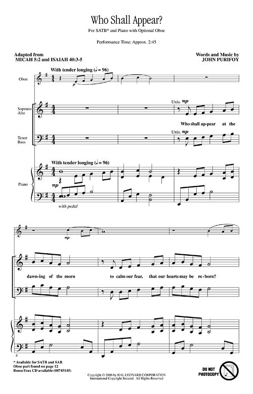 This original Advent anthem by John Purifoy with its haunting melody and oboe obbligato is an invitation to Christ to come and dwell among us. Who shall appear to calm our fears ... to bring hope and light ... and living bread? is affirmed with come and dwell now within us. May be used for Advent or other services of invitation or affirmation.Available separately: SATB and SAB. BonusTrax CD also available. Performance time approx. 2:45.
