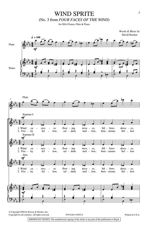 The final two movements in a cycle of four songs characterizing the wind, Wind Sprite reflects the personified wind as being playful and mischievous. The fourth piece, No Wind, is aleatoric with wind chimes and piano and First-Nation Cahto text, using fragments of syllables.