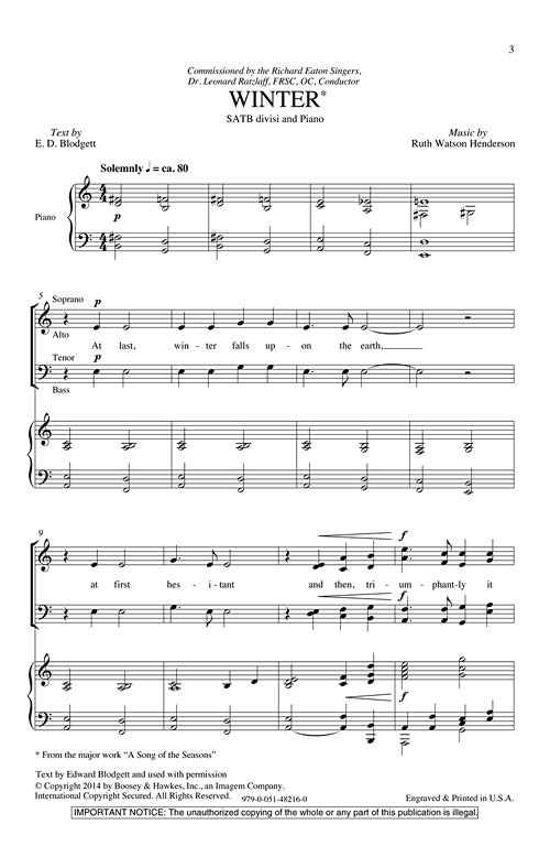 Ruth Watson Henderson has set a wonderful secular winter text using a harmonic language that is accessible to a very good high school choir but worthy of a fine adult ensemble as well. Duration: ca. 4 minutes 30 seconds.