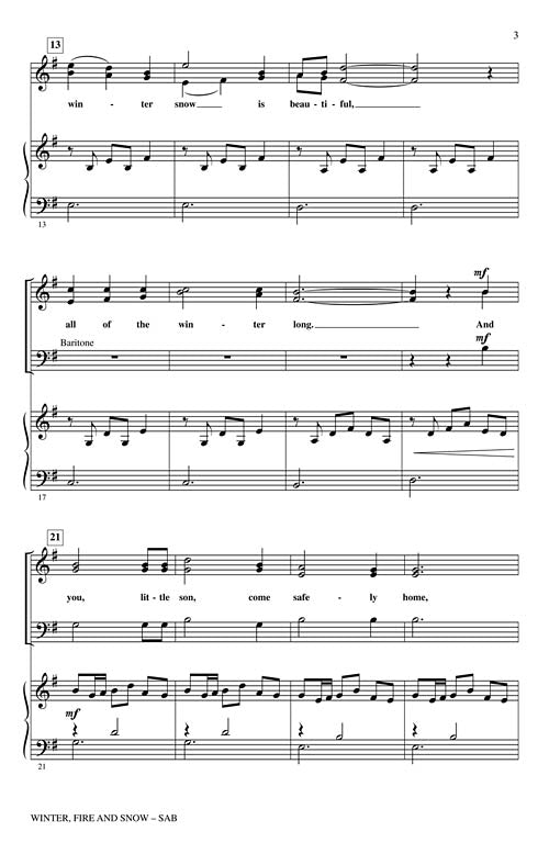 The imagery of fire in the midst of winter snow is perfectly portrayed in this beautiful and mysterious setting of a song by Brendan Graham and MacDara Woods. Wonderfully crafted for choir, piano and cello, you will weave a magical tapestry of sound in concert! Available separately: SATB, SAB, SSA, ShowTrax CD. Duration: ca. 3:15.