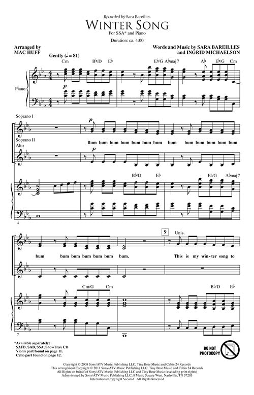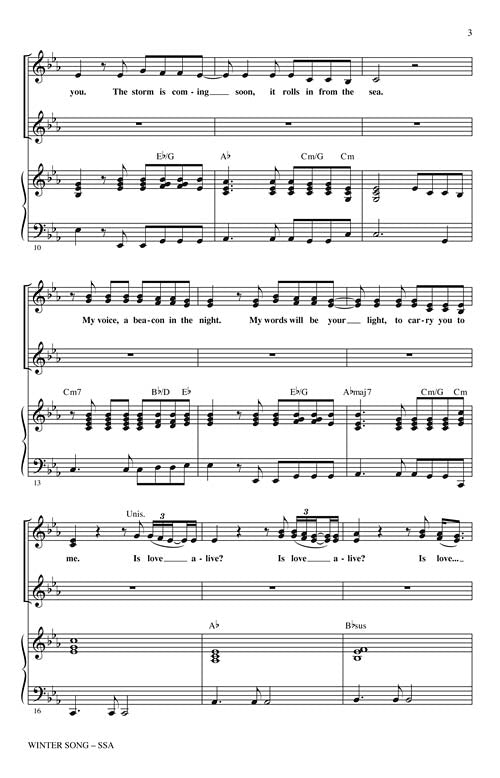This haunting song by Sara Bareilles and Ingrid Michaelson is a poetic reflection on the winter landscape and longing for love, with layered vocals and a rich harmonic underpinning. A starkly beautiful choice for winter programs and pop, jazz and concert ensembles. Optional violin and cello. Available separately: SATB, SAB, SSA, ChoirTrax CD. Duration: ca. 4:00.
