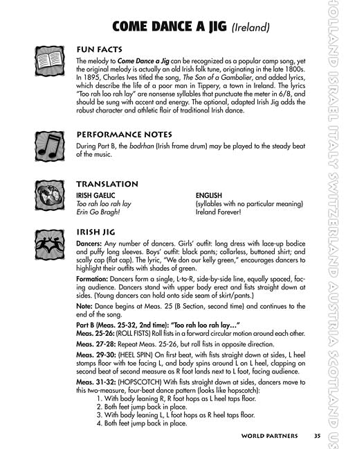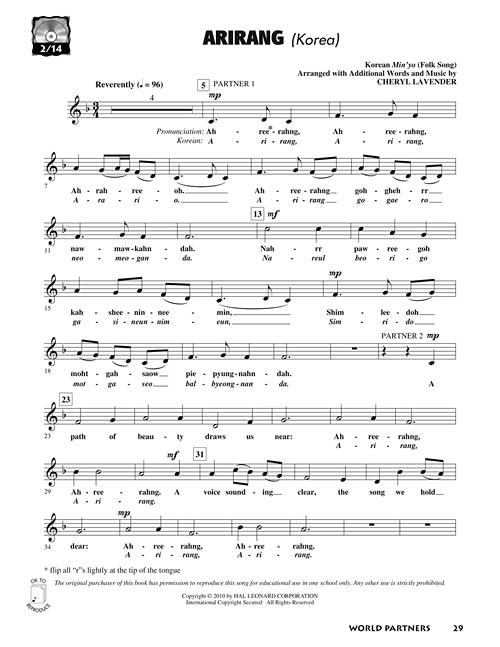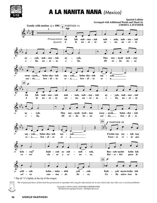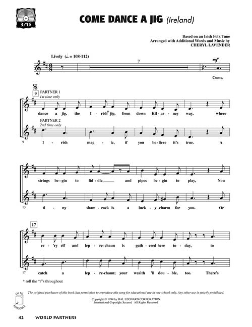 Calling all world brothers and sisters! Travel our musical globe with WORLD PARTNERS! Like the patches of a family quilt, the folk songs of the world's children tell their stories. Arranged by master music educator, Cheryl Lavender, the twelve patches in this collection are shared with the hope that global cultures and traditions might be better understood and celebrated by our world siblings and ultimately come together into the quilt of humanity. For instantly successful and can-do harmonies, these kid-tested folk songs are arranged with catchy, original partner songs and canons. Adaptable for classroom or concert, all songs are reproducible and include piano/vocal arrangements, teaching tips and reproducible songsheets with phonetic pronunciations. For a richer performance opportunity, many songs feature Orff and percussion parts, as well as easy-to-learn folk dances. For added value, there are teaching objectives linked to the National Standards for each song! Available: Teacher Edition (with reproducible pages), Performance/Accompaniment CD, Classroom Kit (Teacher and P/A CD). Suggested for grades 3-8.