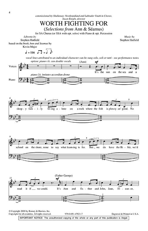 These excerpts from Ann and Séamus-Stephen Hatfield's opera written for Shallaway: Newfoundland and Labrador Youth In Chorus--have been compiled with an eye to their dramatic potential. Choirs may perform the suite in standard choral formation, or they may give a staged or semi-staged performance. Suggestions for soloists, costumes, and choreography are all included.