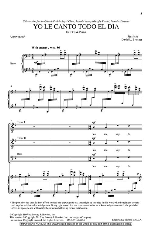 Infectious rhythms and playful melodies characterize this setting of an original Spanish text. Already a hit with Mixed and 2-Part treble choirs, this new voicing for men's voices is long overdue and will be a welcome addition to the men's choir repertoire. Duration: ca. 3:00.
