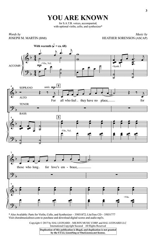 A sacred word of encouragement to those who feel lonely and abandoned, this statement of assurance is so needed in our world. The music moves sensitively through an authentic lyric with lovely lines and tender harmonies, wrapping both singers and listeners in the arms of grace and mercy. Worshipful! Score and Parts (vn, vc, syn) available as a digital download.