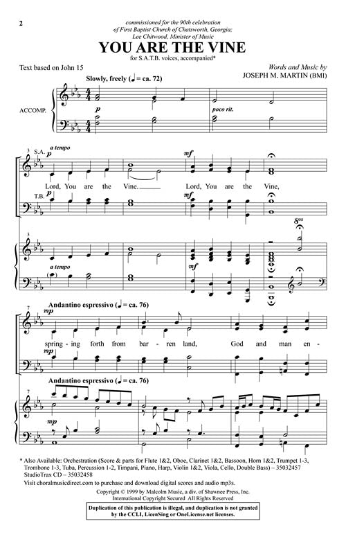 One of the most substantial object lessons in the New Testament is delivered in this epic composition. Moving slowly through many episodes, the anthem has moments of through-composed glory and yet is held together by common melodic and harmonic gestures described by the composer as word painting representing the organic qualities of the vine motif. Towering climaxes mingle with moments of deep expressiveness made all the more glorious by the new orchestration, adding an almost cinematic quality. Remarkable! Score and Parts (fl 1-2, ob, cl 1-2, bn, hn 1-2, tpt 1-3, tbn 1-3, tba, perc 1-2, timp, pno, hp, vn 1-2, va, vc, db) available as a digital download.