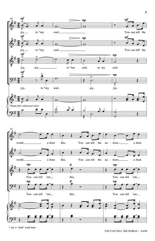 This arrangement of a traditional spiritual is set in an easy swing style and is a song full of hope and joy. All of the voice parts contain divisi and are exposed, allowing the opportunity to feature each section. The end of this arrangement diminuendos to a soft and simple statement signifying the inner joy that each of us can experience when we allow it to happen.