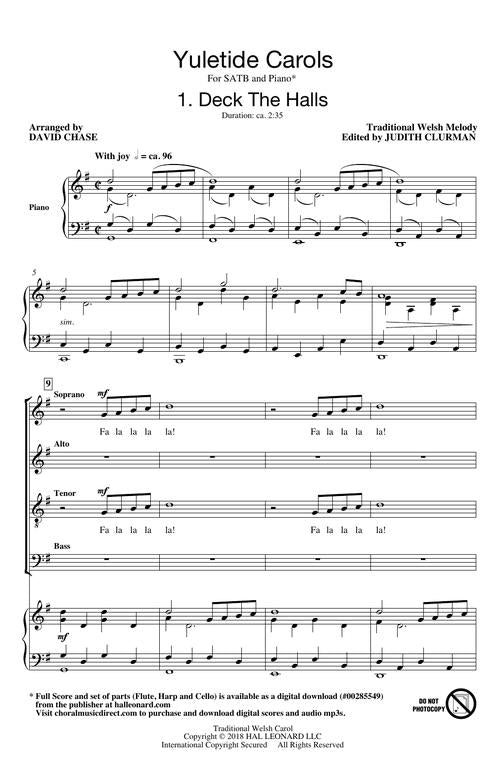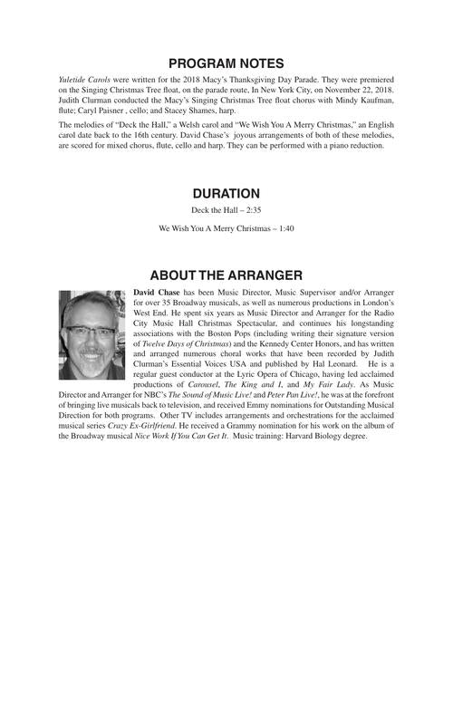 Two carols under one cover, creatively arranged by Broadway and musical theatre icon David Chase. Deck the Halls and We Wish You a Merry Christmas are two up-tempo carols that will fill out your holiday programs for years to come. Including these with David's previously published, best selling carols - The First Noel, God Rest Ye, Angels We Have Heard and Together at Christmas - and you have a creative set of traditional carols.