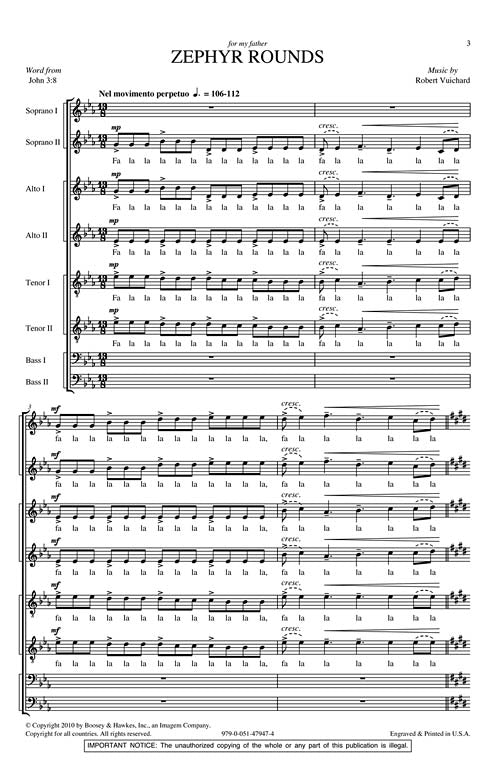 Zephyr Rounds was the winner of the 2007 Yale Glee Club Emerging Composers Competition. The asymmetry of the 13/8 time signature creates a bustling feeling of perpetual motion, blossoming into a thick texture of contrapuntal exchanges and melodic hocket between voices. The result is an infectious rhythmic energy unusual in a piece for a cappella chorus. Duration: ca. 5:50.