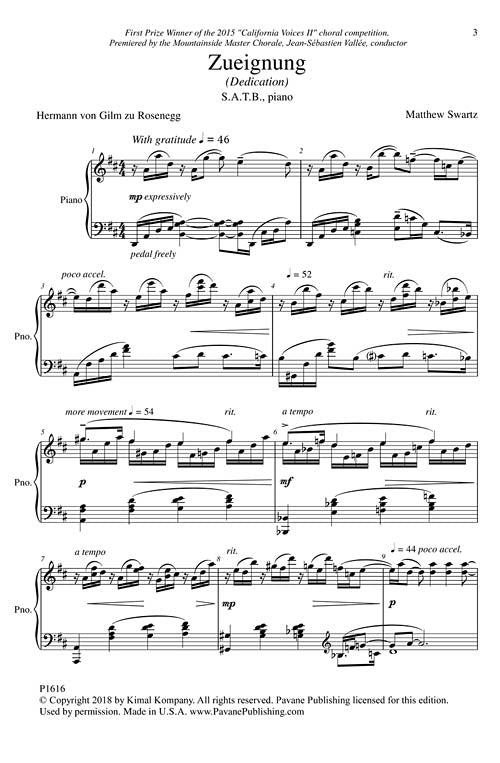 First Prize Winner of the 2015 California Voices II choral competition, this is an artistic rendering worth consideration. Using a German text by Hermann von Gilm zu Rosenegg, composer Matthew Swartz gives us an expression that is both 19th century romantic and undeniably 21st century as well. The art song from the age of Schubert is transformed into a choral statement that does not deny its roots. A beautiful and expressive piece.