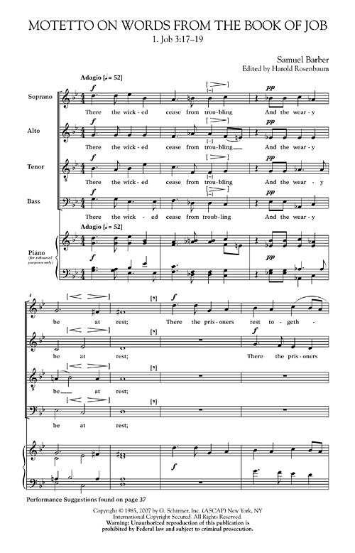 Motetto on Words from the Book of JobPublisher: SchirmerCategory: ChoralSeries: Choral Large WorksFormat: PaperbackMotetto on words from the Book of Job was one of Barber's earliest choral works and until this publication, edited by Harold Rosenbaum,...Regular price $3.99 -