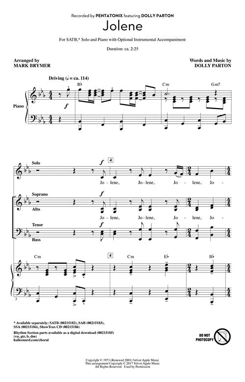 Jolene Pop Choral Series Satb And Solo Dolly Parton