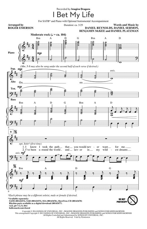 I Bet My Life Pop Choral Series Satb Imagine Dragons