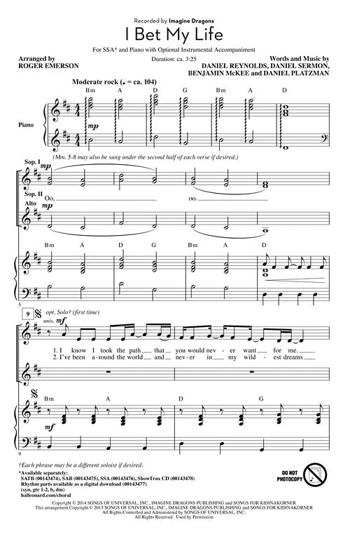 I Bet My Life Pop Choral Series Ssa Imagine Dragons