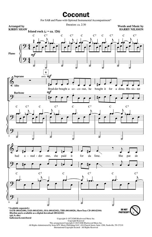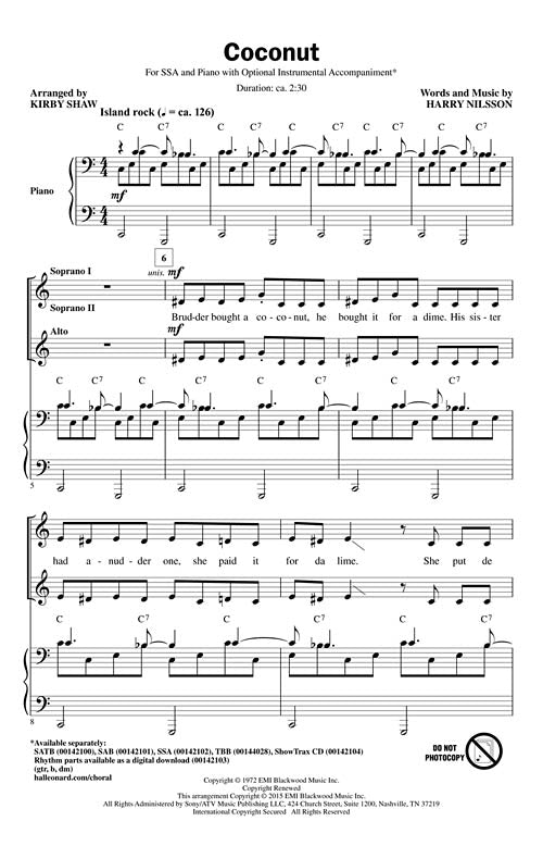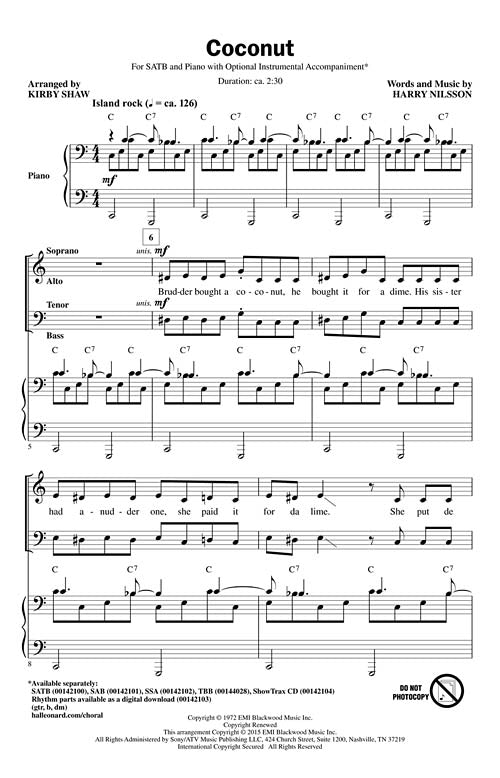 Coconut Pop Choral Series Ssa Harry Nilsson