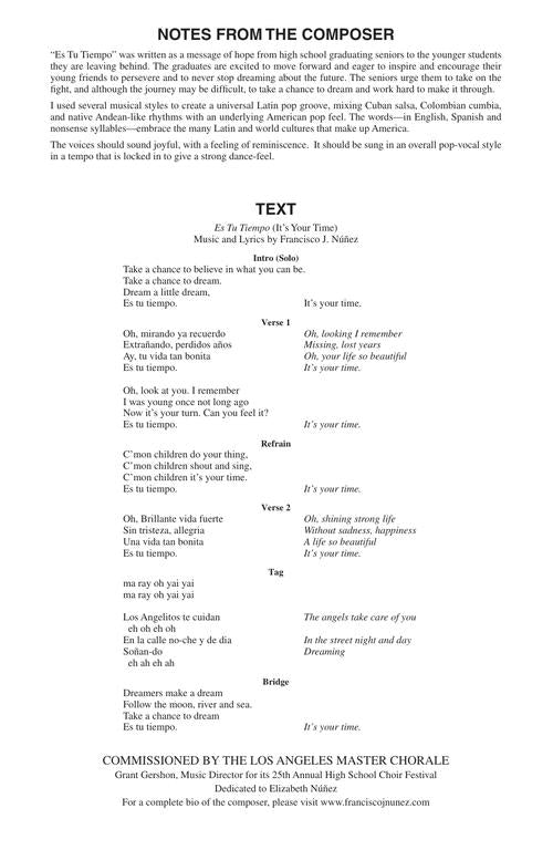 Es Tu TiempoPublisher: Toca MusCategory: ChoralSeries: ChoralFormat: OctavoThis Latin pop song was written as a message of hope from young people to children. Try hard, persevere and never stop dreaming are the themes of this original...Regular price $37.99