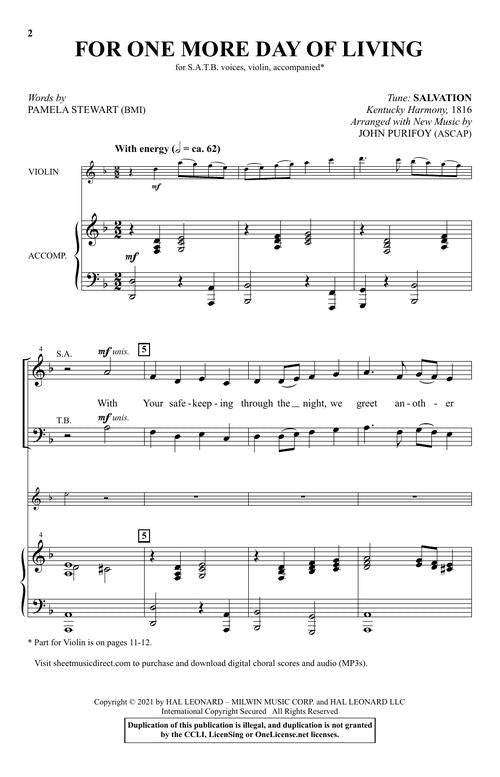 For One More Day of Living SATB W/ VIOLIN Arranger: John Purifoy
