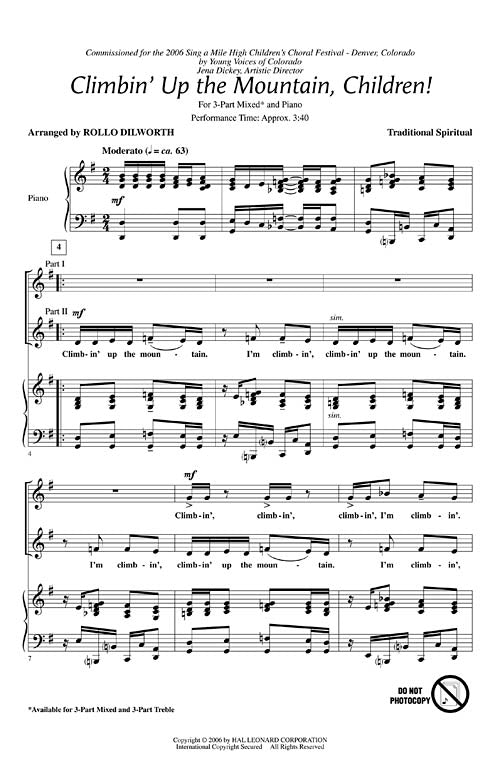 Climbin' Up the Mountain, Children!Composer: Rollo Dilwortharr. Rollo DilworthPublisher: Category: ChoralSeries: Henry Leck Creating ArtistryFormat: Voicing: 3-Part MixedThis arrangement of the traditional spiritual is set in a style that includes elements of both the spiritual and...Regular price $32.99