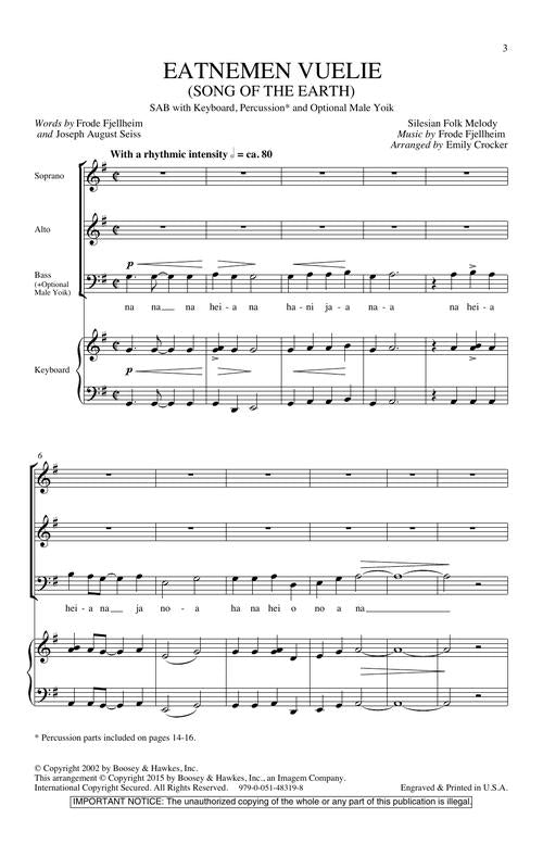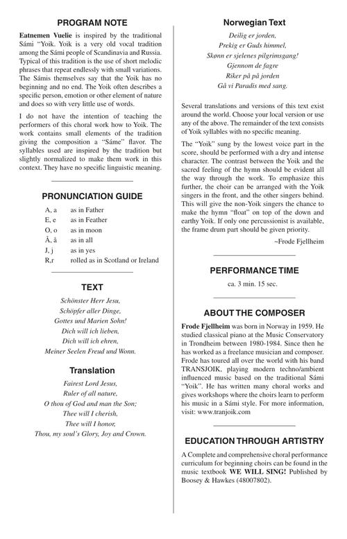Eatnemen Vuelie(Song of the Earth) CME Building BridgesComposer: Frode FjellheimFrode FjellheimPublisher: Boosey & HawkesCategory: ChoralSeries: Building BridgesFormat: Voicing: SABInspired by the traditional Sami yoik, a very old vocal tradition among the Sami people of Scandinavia and...Regular price $33.99 -