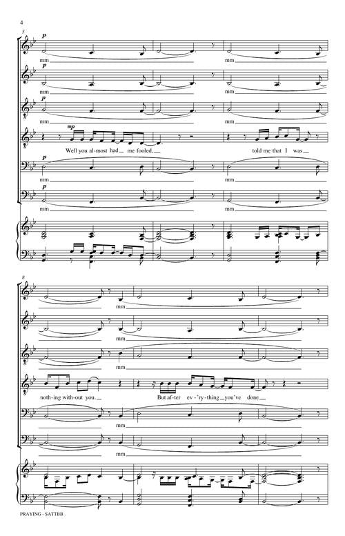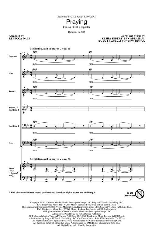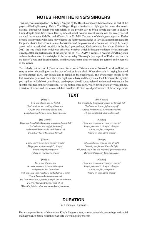 PrayingThe King's Singers Finding HarmonyPublisher: Hal LeonardCategory: ChoralSeries: King's Singers ChoralFormat: OctavoThe King's Singers have included this new arrangement of the Kesha song on their new recording Finding Harmony. This song became synonymous with the #Me...Regular price $29.99 -