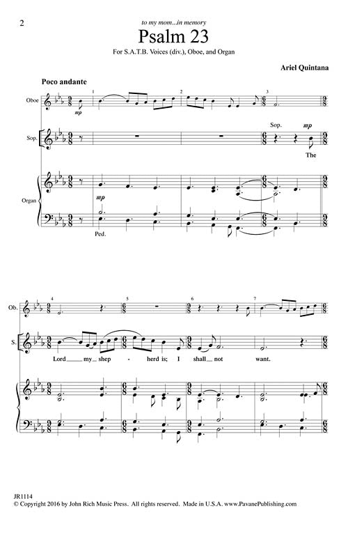 Psalm 23 Publisher: John Rich Music Press Category: Choral Series: Pavane Choral Format: Octavo Who needs another setting of Psalm 23? A valid question. So listen to this setting by Argentinian born composer and Hollywood Presbyterian...Regular price $28.99