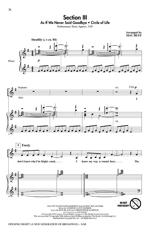 This Title Comes In Quantities Of Five (5) Copies(1 Order=5 Copies) Opening Night A New Generation of Broadway Composer: Mac Huff arr. Mac Huff Publisher: Category: Choral Series: Broadway Choral Format: Voicing: SAB The Lion King,...Regular price $41.99 -
