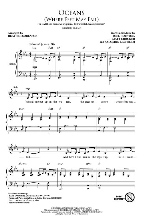 This Title Comes In Quantities Of Five (5) Copies(1 Order=5 Copies) Oceans (Where Feet May Fail) SATB Uses: General, Youth Choir, Praise Team Scripture: Proverbs 3:5-6; Matthew 14:22-33 This Dove Award-winner from Hillsong United has become...Regular price $29.99 -
