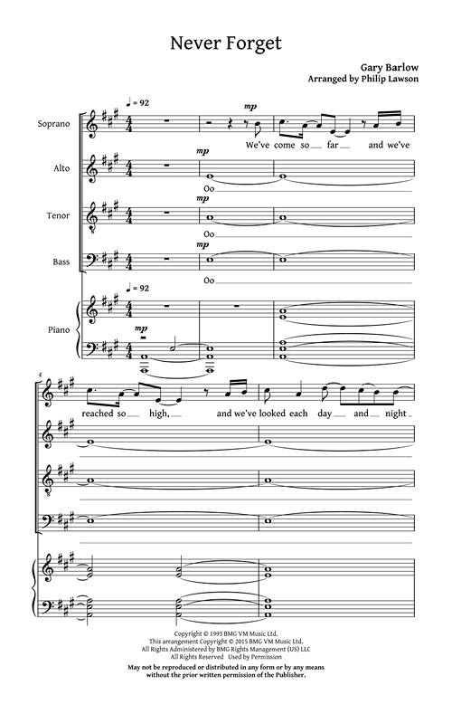 This Title Comes In Quantities Of Five (5) Copies(1 Order=5 Copies) Never Forget SATB A hit for the English pop band Take That, this song has been featured in several live events, including BBC Children in...Regular price $27.99 -