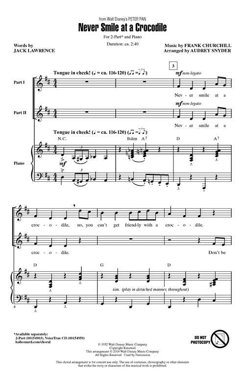 This Title Comes In Quantities Of Five (5) Copies(1 Order=5 Copies) Never Smile at a Crocodile Discovery Level 1 Octavo 2-Part Younger choirs will love performing this playful song from Disney's Peter Pan complete with silly...Regular price $23.99 -