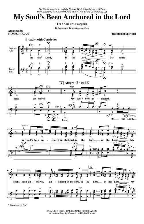 This Title Comes In Quantities Of Five (5) Copies(1 Order=5 Copies) My Soul's Been Anchored in the Lord Composer: Moses Hogan (arr. Moses Hogan) Publisher: Category: Choral Series: Festival Choral Format: Voicing: SATB divisi a cappella...Regular price $28.99
