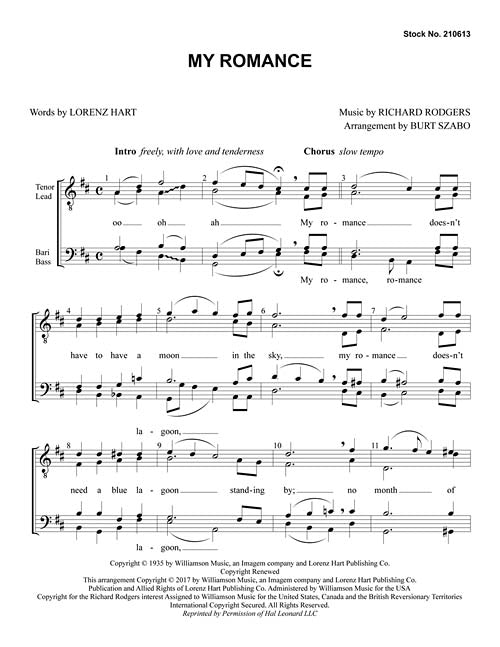 This Title Comes In Quantities Of Five (5) Copies(1 Order=5 Copies) My Romance Artist: Burt Szabo arr. Burt Szabo Publisher: Contemporary A Cappella Publishing Category: Choral Series: Barbershop Harmony Society Format: Octavo Voicing: TTBB a cappella...Regular price $38.99 -