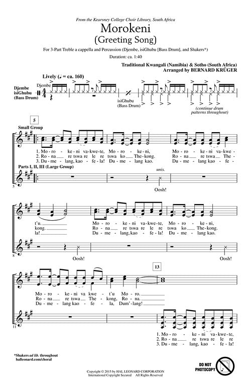 This Title Comes In Quantities Of Five (5) Copies(1 Order=5 Copies) Morokeni (Greeting Song) 3 Part Treble A Cappella This traditional greeting/salutation song of the Kwangali and Sotho people, with authentic call and response vocals, djembe,...Regular price $32.99 -