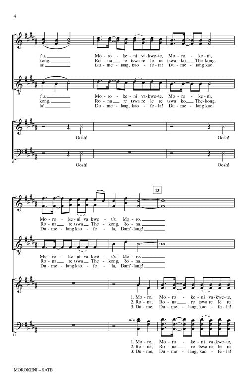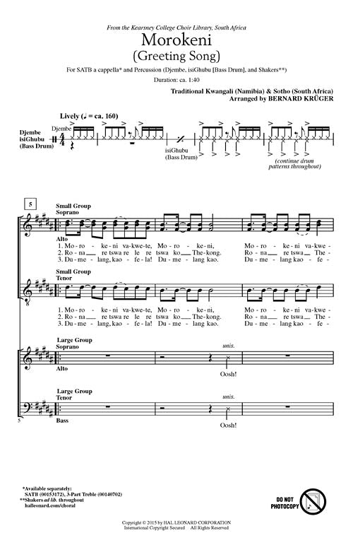 This Title Comes In Quantities Of Five (5) Copies(1 Order=5 Copies) Morokeni (Greeting Song) SATB a cappella Now available for mixed voices! This traditional greeting/salutation song of the Kwangali and Sotho people, with authentic call and...Regular price $26.99 -